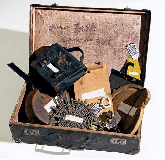 Marcin Harlender, „Białe Kreski nowe”, 2004, 9 obiektów znalezionych: walizka, patelnia, denko